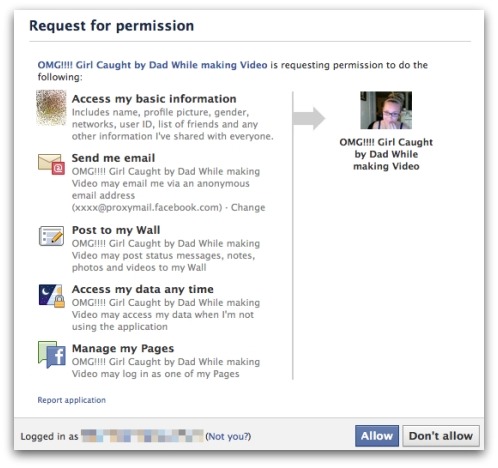 But don’t be fooled by such elementary tricks, this is definitely a scam, and the next page attempts to trick you into giving the third party application access to your Facebook profile, post to your wall, access information about your friends, and even hand over permission for it to spam you in future.