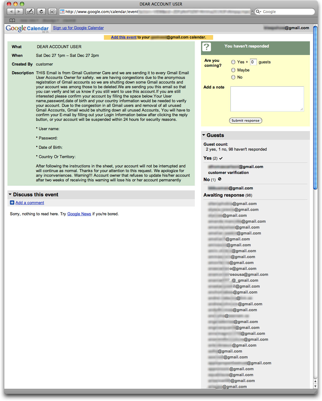 And that’s because it is a genuine Google Calendar invitation to an event (just like you might receive one to a friend’s barbecue or New Year’s Eve cocktail party). And sure enough clicking on the link in the email takes you to a “real event” in your Google Calendar, which it appears a number of other people have been invited to as well.