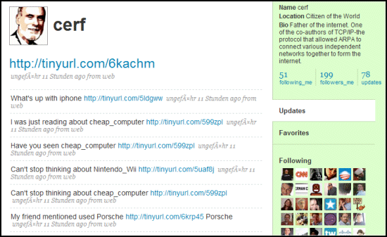 Cerf said he was too busy for things like Twitter, and clearly the account was set up by some enterprising opportunist who delighted in getting people to follow him and his unwanted adverts.